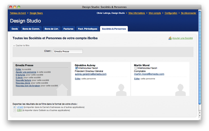 Gardez une trace des interlocuteurs chez vos clients en saisissant des fiches contact. Vous avez la possibilité de définir des “interlocuteurs favoris”, ainsi iScriba les sélectionne automatiquement lorsque vous envoyez un document, une relance ou tout autre type de communication.